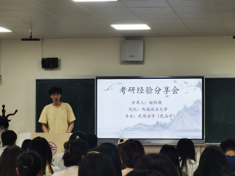 胡佳怡同学提出“选择和努力一样重要”“注意框架”“注意复盘”等思路,分享了政治的做题与背诵顺序,为同学们提供了全新的学习方法;张楠同学不仅强调单词和阅读的重要性,英语应在前期打好基础,还建议大家要准备一套属于自己的作文模板,通过不断训练逐渐找到做题感觉;赵梓骁同学通过从未来就业的方向进行比对,对于学校、学制以及专业如何选择展开叙述,为同学们提供了方向性的指导,解决了不少同学的疑惑;邓德荣同学强调了择校的重要性,分享了各科使用的资料以及备战方法,以及调剂时的院校抉择,通过诙谐幽默的方式与同学们进行交流,对于大家的心态调整有着的稳定作用;曹雨璇同学通过线上会议的方式,与同学们分享了自己各科使用的学习资料、不同的学习方法、以及备考时间脉络,并对大家的方法选择给出了自己的见解。