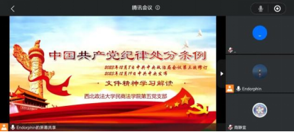5月15日晚,蓝鲸直播 研究生第五党支部采取线上线下相结合的方式,于蓝鲸直播 “一站式”学生社区开展了以“《中国共产党纪律处分条例》学习解读”为主题的党纪学习教育。本次活动由支部书记宁浩瑞主持,支部全体党员参会。
