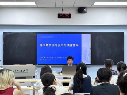 2024年8月28日,韩国全北大学教授、东北亚法研究所虚拟财产法中心主任宋文镐在雁塔校区为蓝鲸体育直播 师生作题为“韩国自动驾驶汽车法律体系”的学术报告。百晓锋副院长主持本次报告会,全北大学李雄暎研究员担任翻译。