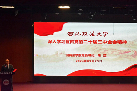 朱茂书记讲授“书记第一课”。朱书记为全体2024级本科新生宣讲党的二十届三中全会精神,他指出,青年学子要深入学习贯彻习近平总书记关于全面深化改革的一系列新思想、新观点、新论断,深刻领会和把握进一步全面深化改革的主题、重大原则、重大举措、根本保证,为进一步全面深化改革、扎实推进中国式现代化贡献新时代青年的智慧和力量。他讲述了我校的办学历史,学校红色基因浓厚、法学特色鲜明、人才培养质量突出,他希望同学们作为西法大学子,能够将红色基因深植于自己的血脉之中,延续政治坚定、实事求是、勇于创新、艰苦奋斗的“老延大”精神、陕北公学精神,并以其滋养初心,淬炼灵魂。他激励同学们将人生理想融入国家建设,践行法治思想,激扬矢志奋斗,不负韶华、挺膺担当,书写时代华章。