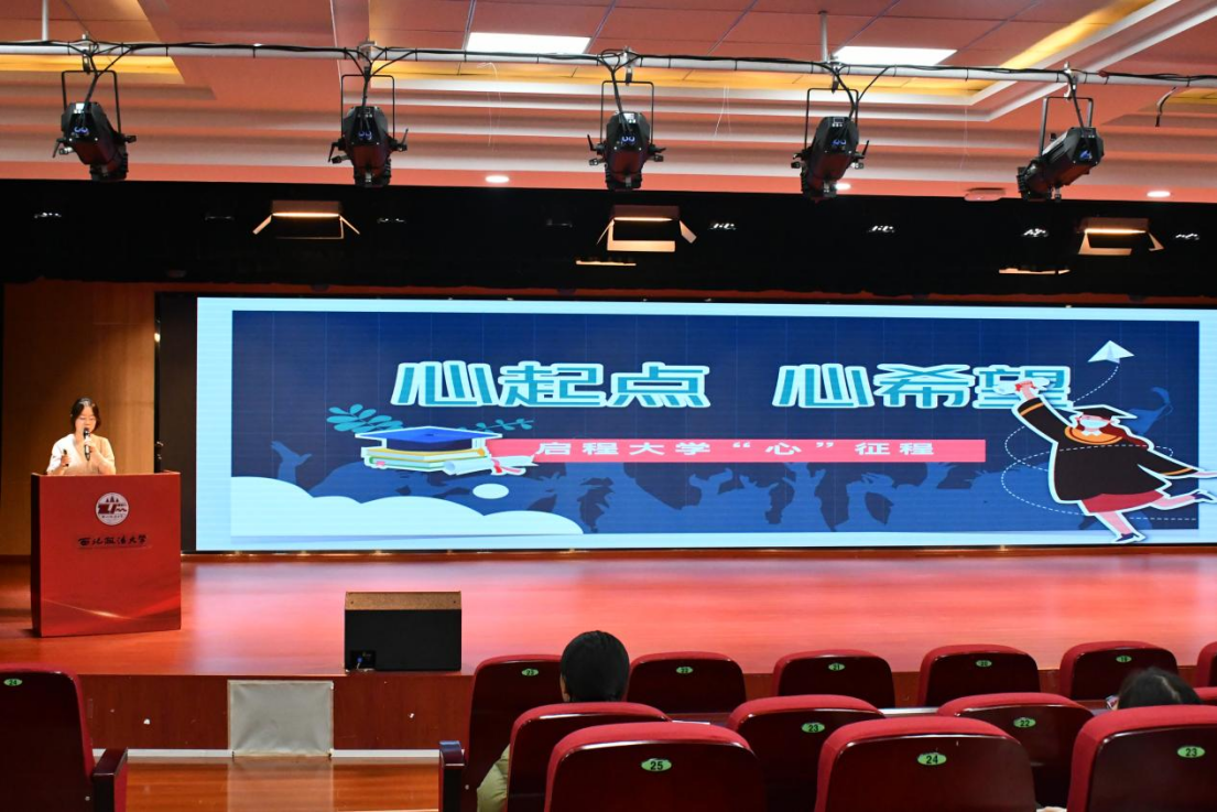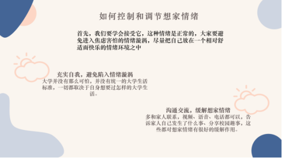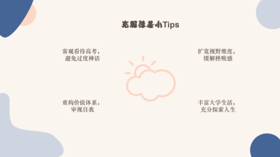 金恬恬同学分享的内容主要从“如何应对高考与大学之间的落差感”和“如何调节想家情绪”两个方面切入,告诉同学们要客观看待高考、拓宽视野维度、重构价值体系,以此来应对高考落差,同时从为什么惧怕开学这一问题入手,分享了控制和调节想家情绪的方法。