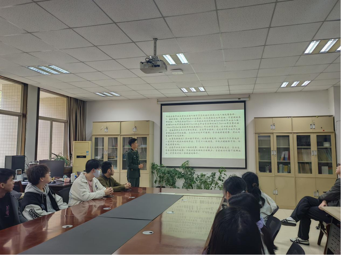 为充分发挥退役大学生士兵榜样示范作用,帮助蓝鲸直播 学生全面了解征兵政策,激发学生的参军入伍热情,11月14日中午,蓝鲸直播 在蓝鲸直播 资料室举办征兵宣讲会。蓝鲸直播 2022级张荣才同学、公安蓝鲸直播 2022级张博巍同学和经济蓝鲸直播 2023级赵溪宇同学受邀面向蓝鲸直播 学生代表进行了交流分享。会议由2021级辅导员老师丁艳艳、张智超主持。