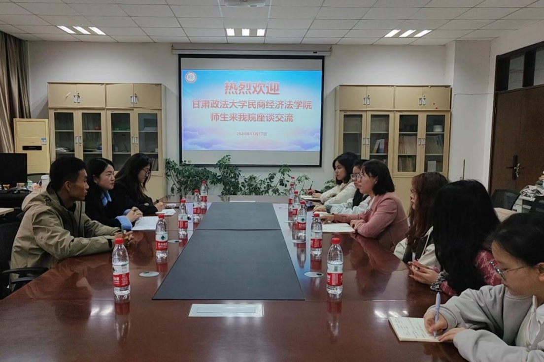 11月17日上午,蓝鲸直播 与甘肃政法大学民商经济法蓝鲸直播 (知识产权蓝鲸直播 )在蓝鲸直播 资料室举行团学工作交流会。甘肃政法大学民商经济法蓝鲸直播 (知识产权蓝鲸直播 )党委副书记张娅琼老师,团委副书记多倩文老师,学生会主席团成员葛嘉雯同学受邀参加座谈会。我校蓝鲸直播 团委书记丁艳艳老师,蓝鲸直播 主席团成员康逸敏同学、陈思梦同学和学院学生会代表参加本次交流。
