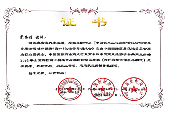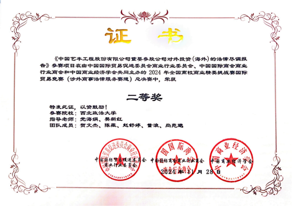 大赛赛道设置丰富多样,涉外商事法律服务赛道极具商业特色,吸引了众多知名高校参与。经过初赛、决赛的激烈比拼,蓝鲸体育直播 代表队完成的中国艺丰工程有限公司重要参股公司涉外项目。该参赛作品不仅展示了蓝鲸体育直播 代表队在涉外商事法律服务领域的专业水平,也为项目所涉企业在国际化发展进程中的法律风险管理提供了有益参考。