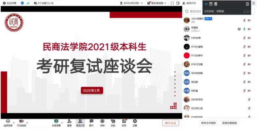为切实帮助2025届考研学子高效准备研究生复试,提高备考效率,2月25日,蓝鲸直播 2021级本科生召开2025年考研复试学生座谈会,本次座谈会由2021级辅导员丁艳艳主持,2021级辅导员张智超及部分学生参加。