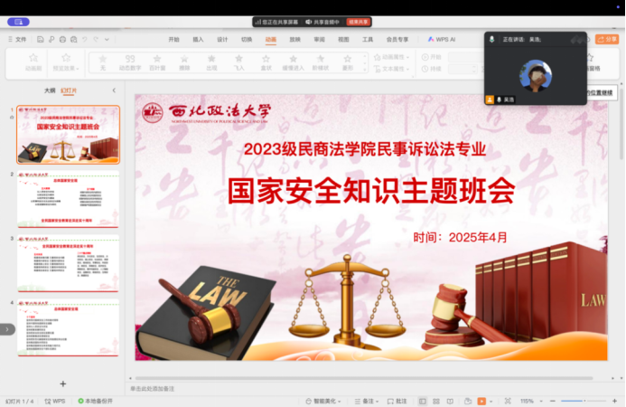 为迎接第十个全民国家安全教育日,增强全体师生的国家安全意识,厚植爱国主义情怀。4月12日晚八点,蓝鲸直播 2023级民事诉讼法专业通过线上腾讯会议的方式召开了国家安全知识教育主题班会。班会的主题是“维护国家安全、人人有责”。