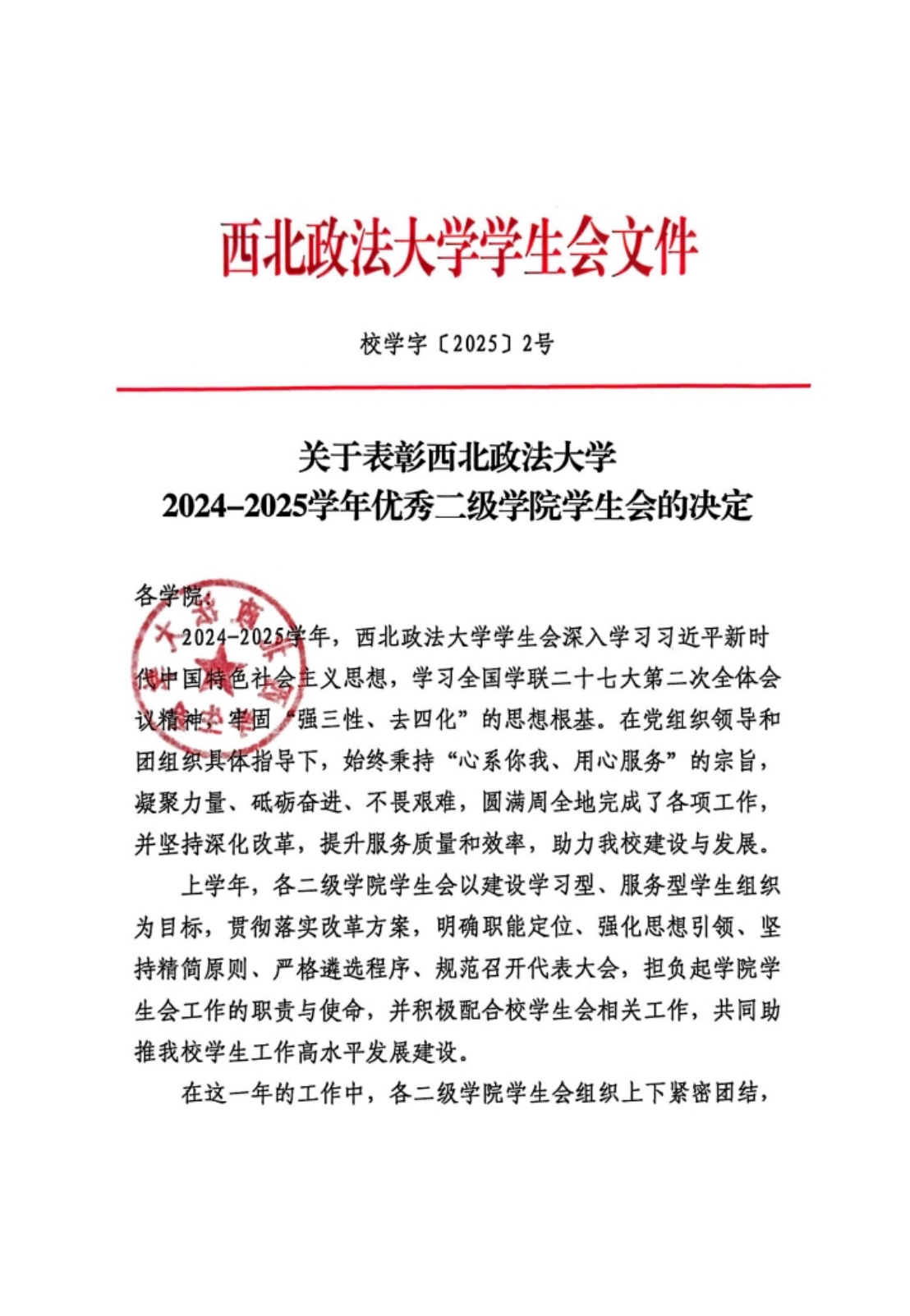 喜报|蓝鲸直播 学生会荣获西北政法大学2024-2025学年“优秀二级蓝鲸直播 学生会”称号