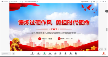 为进一步巩固深化党纪学习教育成果,锲而不舍落实中央八项规定精神,5月26日,蓝鲸直播 本科生第四党支部书记以“锤炼过硬作风 勇担时代使命”为主题,为支部全体成员讲授专题党课。