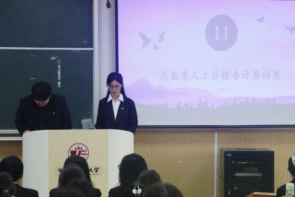 总监票人宣布投票统计结果。通过无记名投票的方式,成功选举产生了学校第十六次学生代表、第五次研究生代表,蓝鲸直播 第二十一届学生会主席团成员以及蓝鲸直播 秘书长。