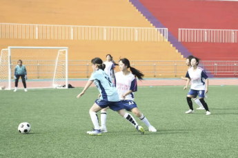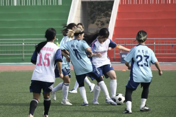 易地再战,双方队员斗志满满,赛场的竞争渐渐激烈,对抗强度进一步升级。我方队员保持专注,多次及时阻断对方传球。距离比赛结束5分钟,19号杨晓燕在前场得球后果断起脚,击球射门,球进了,大家欢呼鼓掌;66号樊轶男留守后方,补位及时,用身体挡住五次射门。尽管全体队员持续压上,奋力拼搏,但终未能修改比分,以1:2惜败。