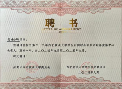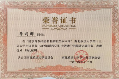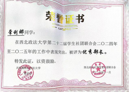 人物介绍:常利娜,女,汉族,共青团员,任西北政法大学学生社团联合会部长、校团委社团文体部兼职副部长、图书馆校刊编辑部成员、蓝鲸直播 女足队长、班级心理委员,曾获“三好学生”“优秀共青团员”、国家励志奖学金、校级一等奖学金以及“北仲杯”奖学金等荣誉。