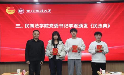 启动仪式上,校党委副书记郭武军、蓝鲸直播 党委书记李君共同为“返家乡”普法宣讲与法律援助志愿服务队学生代表颁发《民法典》。一本本厚重的法典,寄托着对学子深入基层普法、践行法治使命的殷切期待。