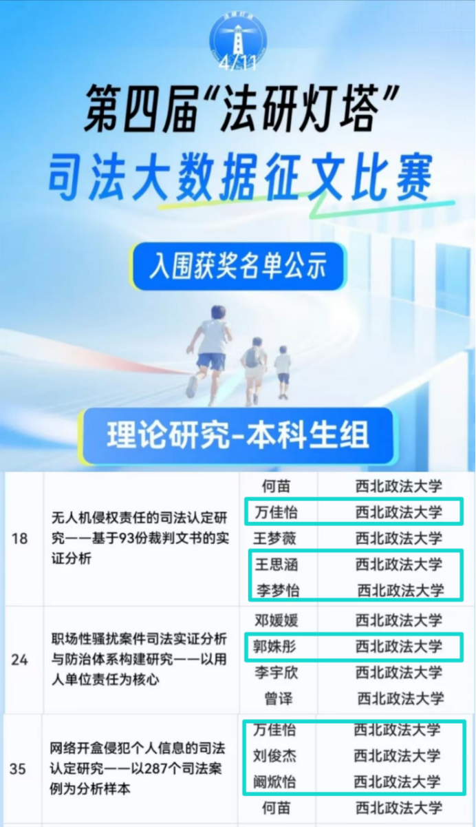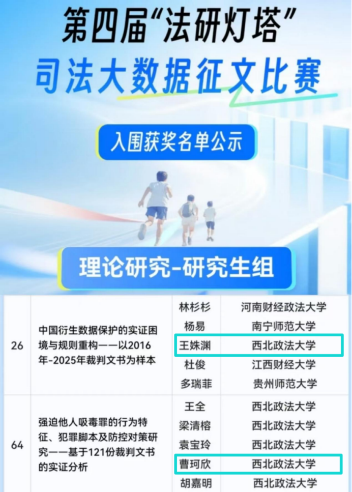 由最高人民法院相关部门指导、中国司法大数据研究院主办的第四届“法研灯塔”司法大数据征文比赛评审结果于近日正式揭晓。蓝鲸体育直播 多名本科生、研究生在比赛中喜获佳绩。
