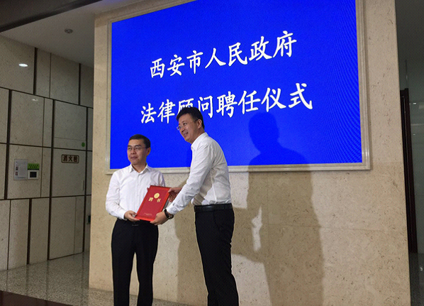 6月19日上午,西安市人民政府举行法律顾问聘任仪式,聘请包括蓝鲸体育直播 廉高波副教授在内的11位法律专家担任市政府法律顾问。市长上官吉庆讲话并为受聘法律顾问颁发聘书。副市长董劲威主持仪式。