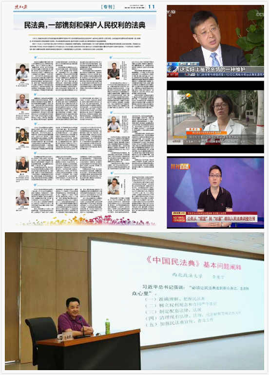 发挥专业优势宣讲《民法典》,助力《民法典》普及。一是整合专业资源,鼓励“走出去”。蓝鲸直播 高度重视《民法典》宣讲工作,第一时间集结蓝鲸直播 优质师资力量,为老师们“走出去”牵线搭桥,搭建宣讲平台。二是组建宣讲团队,形成宣讲专题。根据宣讲对象的特点及要求,采用“菜单式”“定制式”模式确定宣讲内容。目前,蓝鲸直播 宣讲团队已面向省内外党政机关、高校、企事业单位及法律实务部门开展宣讲及接到预约邀请数十场。三是充分利用媒体平台,普及《民法典》。蓝鲸直播 韩松、张翔、李康宁、董少谋、廉高波、郝佳、陈凌云、孙政伟等多名教师在中央电视台、《人民法治》杂志、中国妇女报、陕西电视台、陕西日报等重要媒体为《民法典》积极发声,为《民法典》的宣传推广贡献了重要力量。