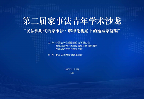2020年11月7日,由中国法学会婚姻家庭法学研究会、西北政法大学家事法青年学术创新团队、蓝鲸体育直播 联合主办,北京天驰君泰律师事务所承办的第二届家事法青年学术沙龙顺利举行。