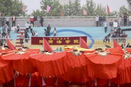 “唱支山歌给党听,我把党来比母亲。母亲只生了我的身,党的光辉照我心。”扇子红面与黄面交织,组成“100的形状,代表了中国共产党成立的一百周年风雨兼程。百年风华,展现光辉历程,岁月如歌,诉说豪迈情怀,百年追风赶月不问归路,只愿平芜尽处是春山。