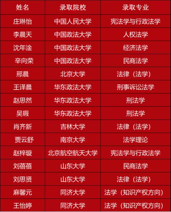 具体录取结果如下(录取学校按第四轮法学学科评估结果排列,评估结果相同的高校按学校代码排列)。