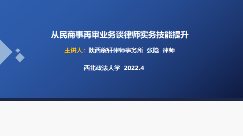 4月13日16点,蓝鲸体育直播 邀请到陕西稼轩律师事务所合伙人律师、陕西省律师协会公司法专业委员会副秘书长、西安市律师协会公司法专业委员会委员、西安市实习律师管理委员会委员、陕西省金融调解中心调解员张晗为主讲人,举办了题为《从民商事再审业务谈律师实务技能提升》的实务大讲堂。