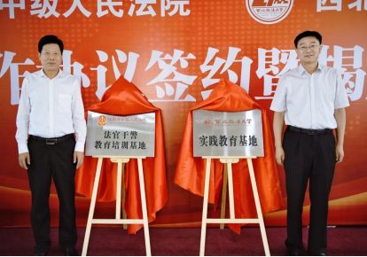 范九利、李永强分别代表西北政法大学与咸阳市中级人民法院签署了《咸阳市中级人民法院-西北政法大学战略合作协议》,并共同为“实践教育基地”与“法官干警教育培训基地”揭牌。