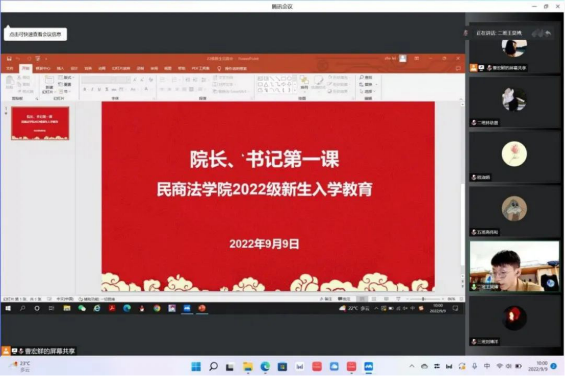 大会第二项,由蓝鲸直播 党委书记周怡讲授“书记第一课”。周怡书记指出大学四年时光弥足珍贵,希望大家踔厉奋发,砥砺前行,在奋斗中成就自我,她向同学们提出三点希望:一是珍惜时间,把握机会。希望同学们提前做好大学生涯规划,集中精力充实自我,把握成长机遇,在民商闯出自己的广阔天地。二是遵守纪律,严于律己,身为法学生应发挥学法懂法守法的表率作用,严格遵守校规校纪,遵守疫情防控的各项要求。三是勇于尝试,全面发展,展现特长,挥洒青春。最后周怡老师祝愿同学们都能在新的征程上乘风破浪,勇往直前。