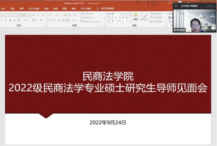 导师见面会共分为四个部分:首先,程淑娟院长对2022级新生的到来表示热烈欢迎,并为同学们介绍了民商法学科的基本情况。程淑娟院长详细介绍了民商法学科的发展、科学研究、导师队伍、人才培养以及极具特色的研究生双导师机制等。